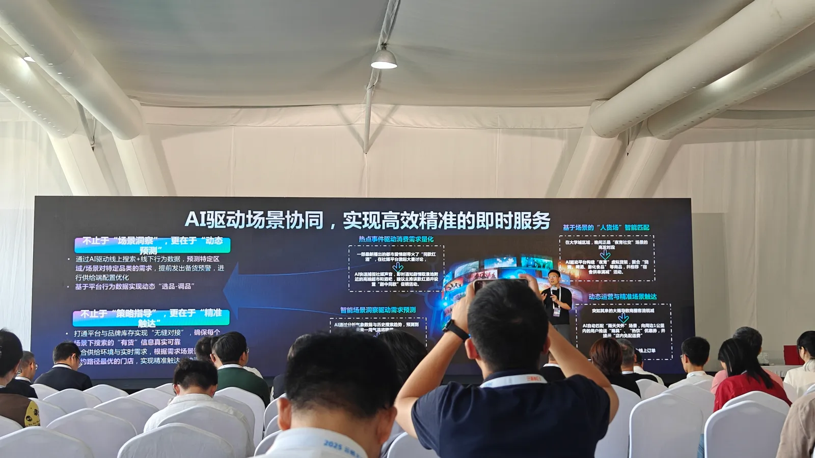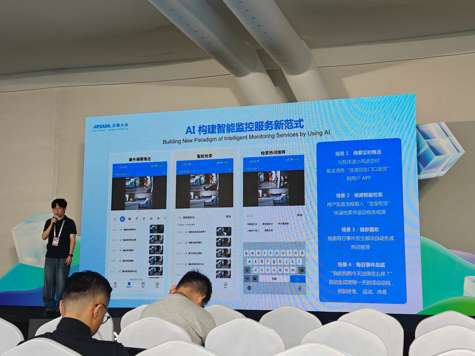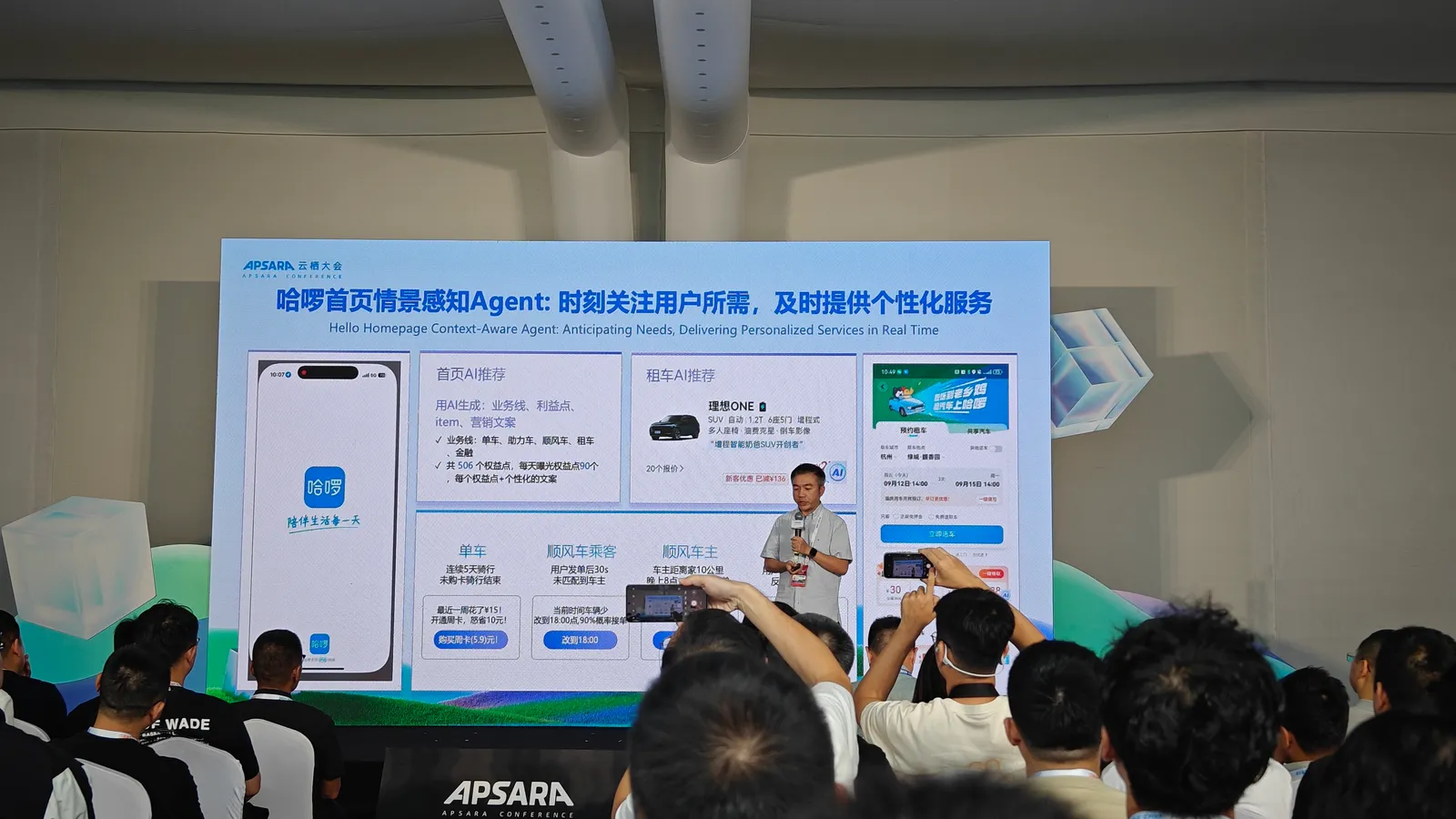 这是哈啰的演讲(中途加入的,因为到下个议程还有20分钟的空余时间,决定留下来听会儿),因为演讲者的几个场景举例不是很恰当,也可能是我理解不了,搞不清楚AI在其中的作用是啥,所以听到中途我就撤了。下面是他举的几个例子: