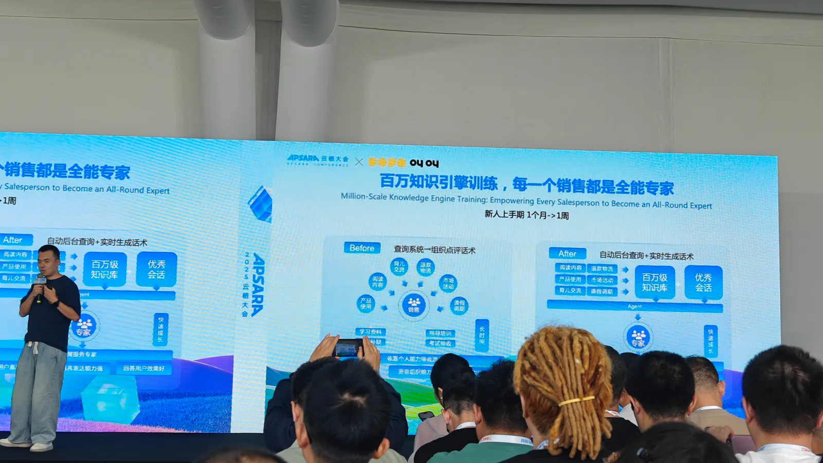 这场听完就记得一个智能外呼系统,通过分析优秀员工与客户的对话录音,先由专家设置场景和回复内容,后期再由AI自己划分业务场景、确定通话流程、制定对话内容,逐渐调优的一个过程。(可现在的AI电话客服,好像业务能力还是一般啊🌚)