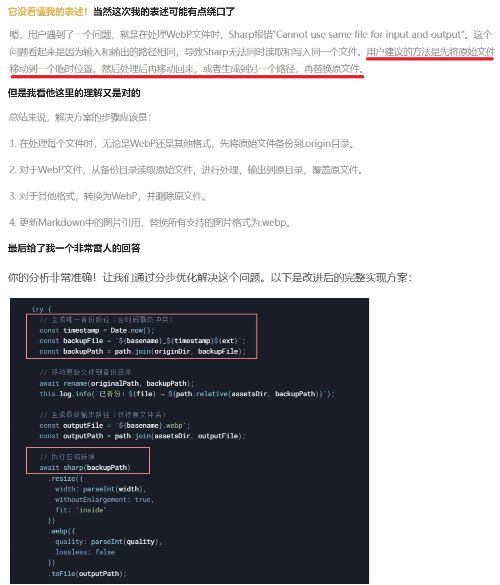 对于webp文件的处理似乎有问题,报错为Cannot use same file for input and output。是不是可以先移动,再使用移动后的图片路径去压缩,然后将压缩后的图片生成到附件目录下,再修改md文件的引用?