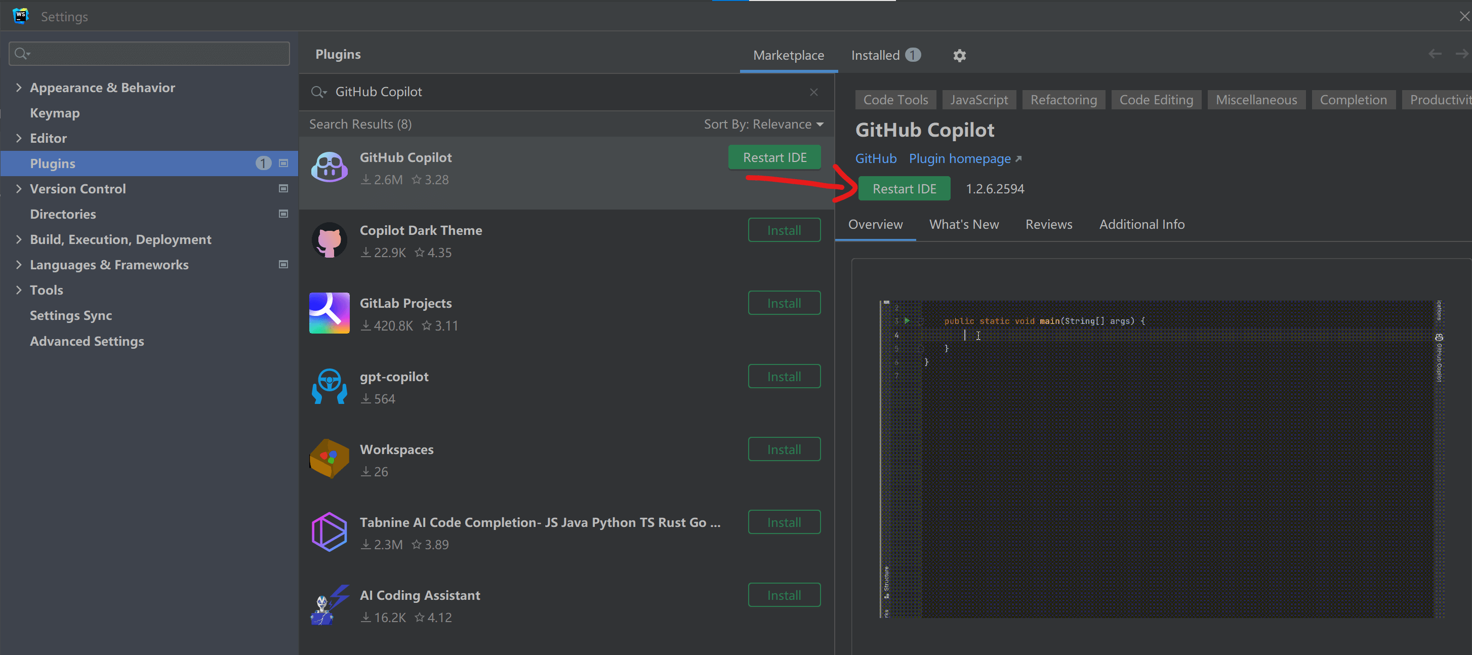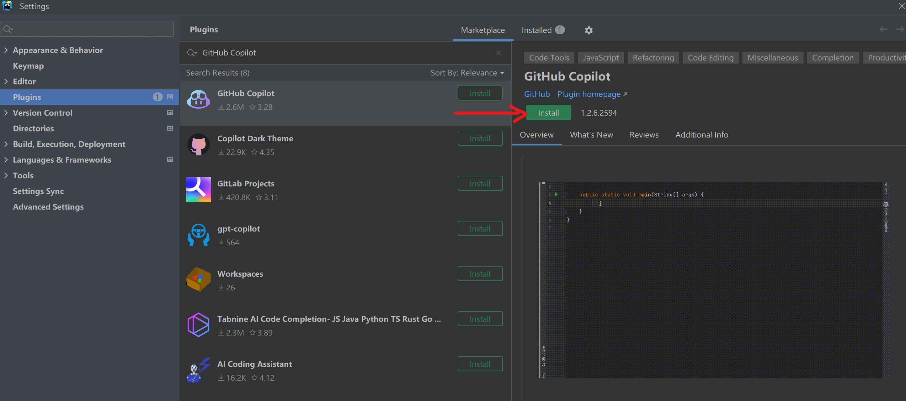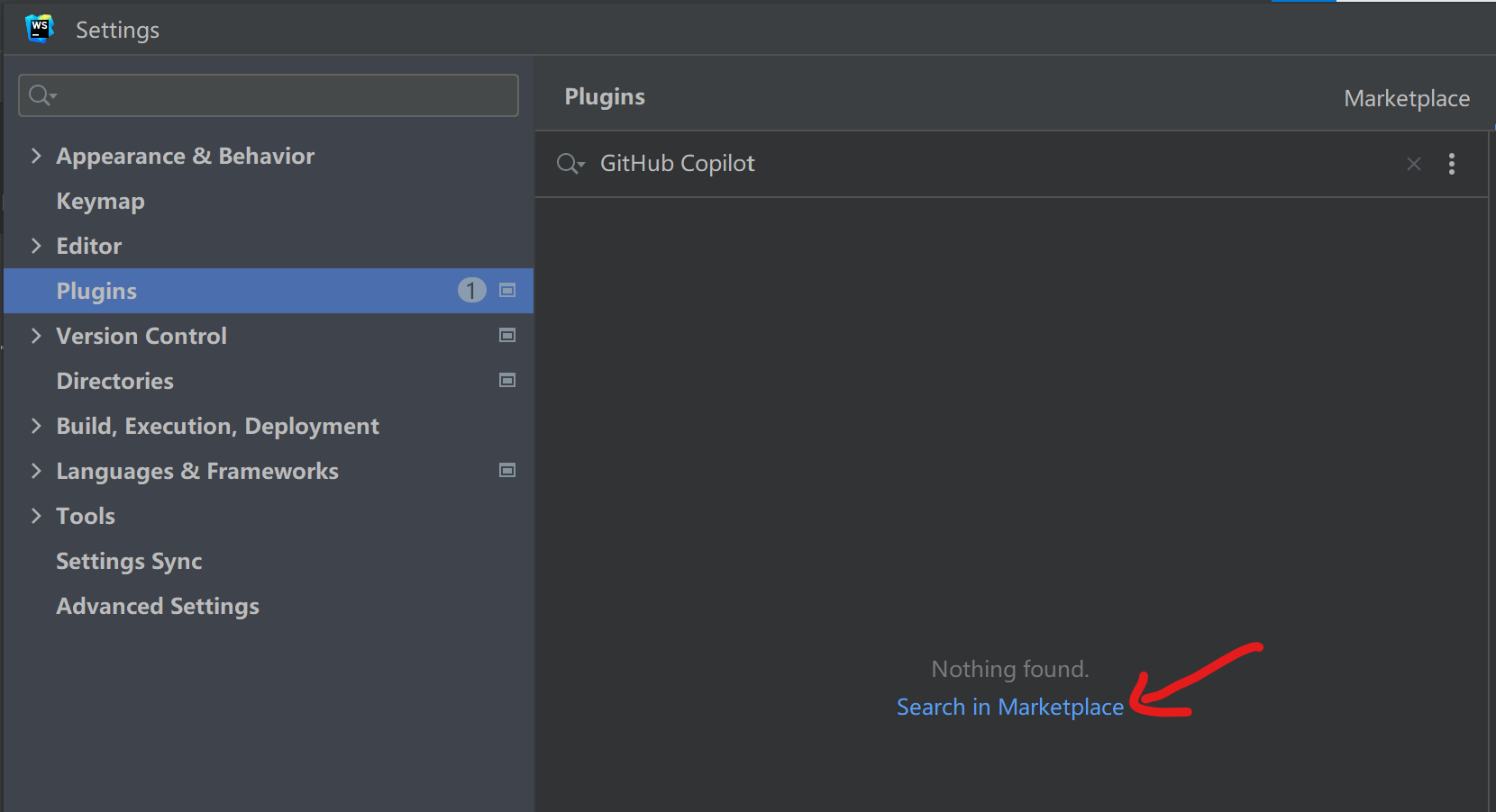 第二步:选择『Plugins』Tab栏,在搜索框中输入GitHub Copilot(如果没有出现搜索结果,请点击下方的Search in Marketplace)