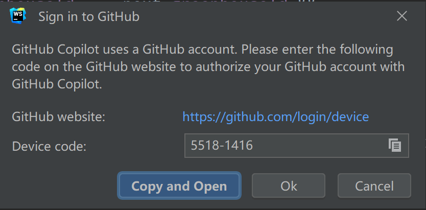 第五步:点击**Copy and Open**复制设备码并打开Github网址进行绑定(IDE重启后会自动弹出登录框,如果未弹出则点击底部右侧工具栏的插件图标),