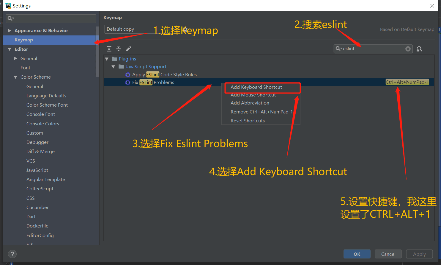 之前我以为格式化代码不就是CTRL+SHIFT+L么,为啥还要单拎出来说?其实CTRL+SHIFT+L只是格式化代码,eslint的快捷键默认是未设置的,我们需要手动在设置中设置他。