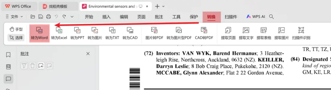 - 先通过WPS将PDF格式的专利文件转为WORD文件。(这一步只需要WPS会员即可,不限制次数)