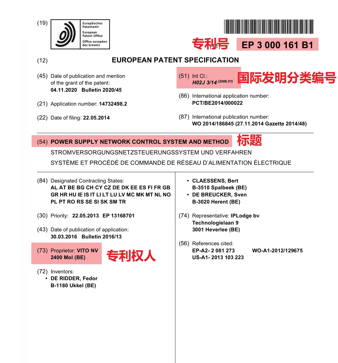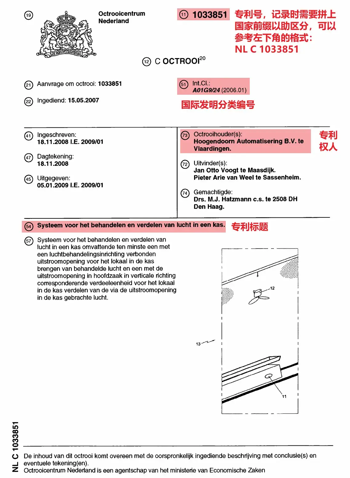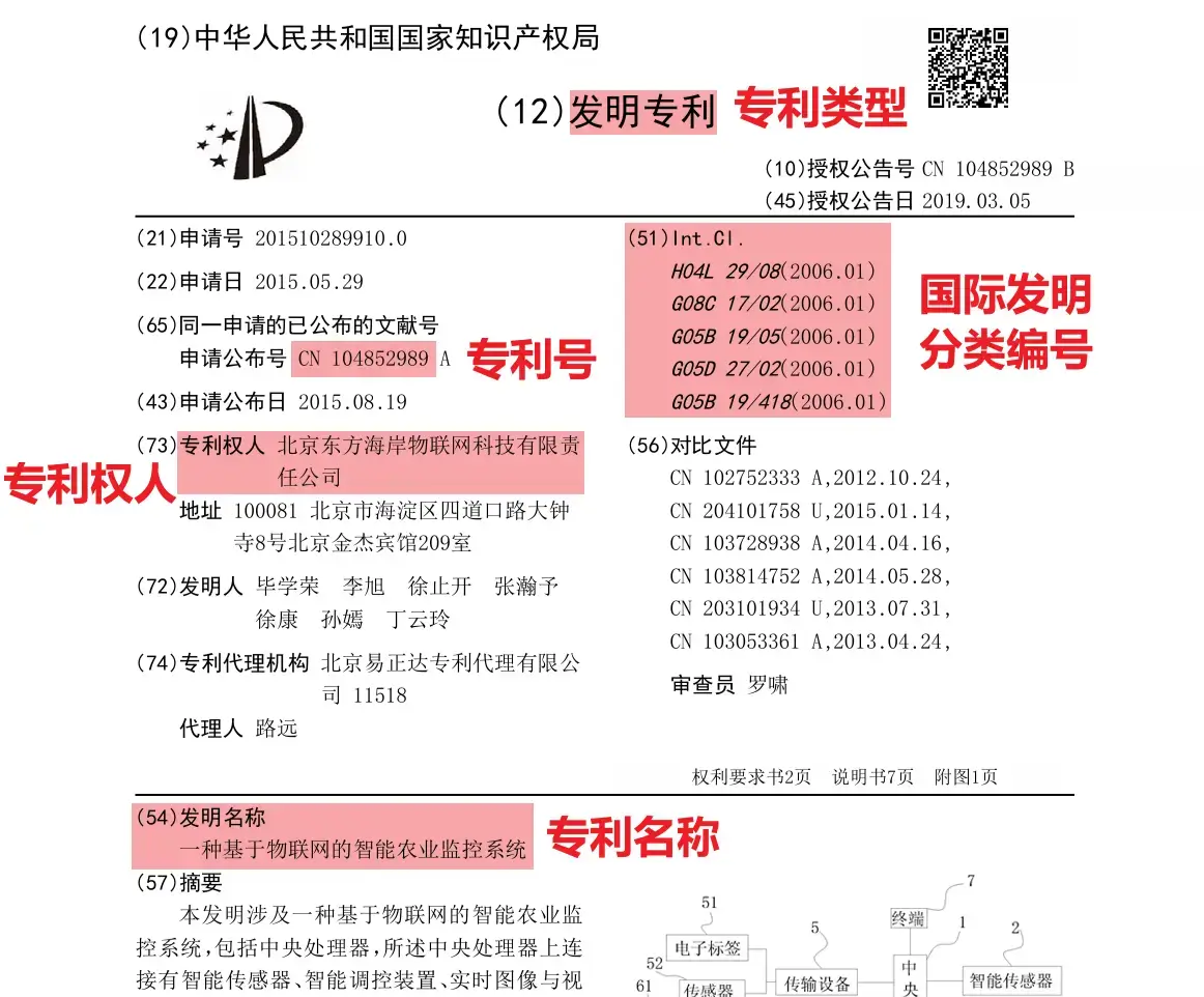 - Int.CI. :国际发明分类系统(International Classification of Inventions),对专利和实用新型进行分类的分级系统,将技术分为8个部类,包含大约七万个复分类。每个专利文件在发布时都会标明适当的IPC分类号,这些分类号由公布专利文件的国家或地区工业产权局分配,对于PCT文件,则由国际检索单位(ISA)分配。