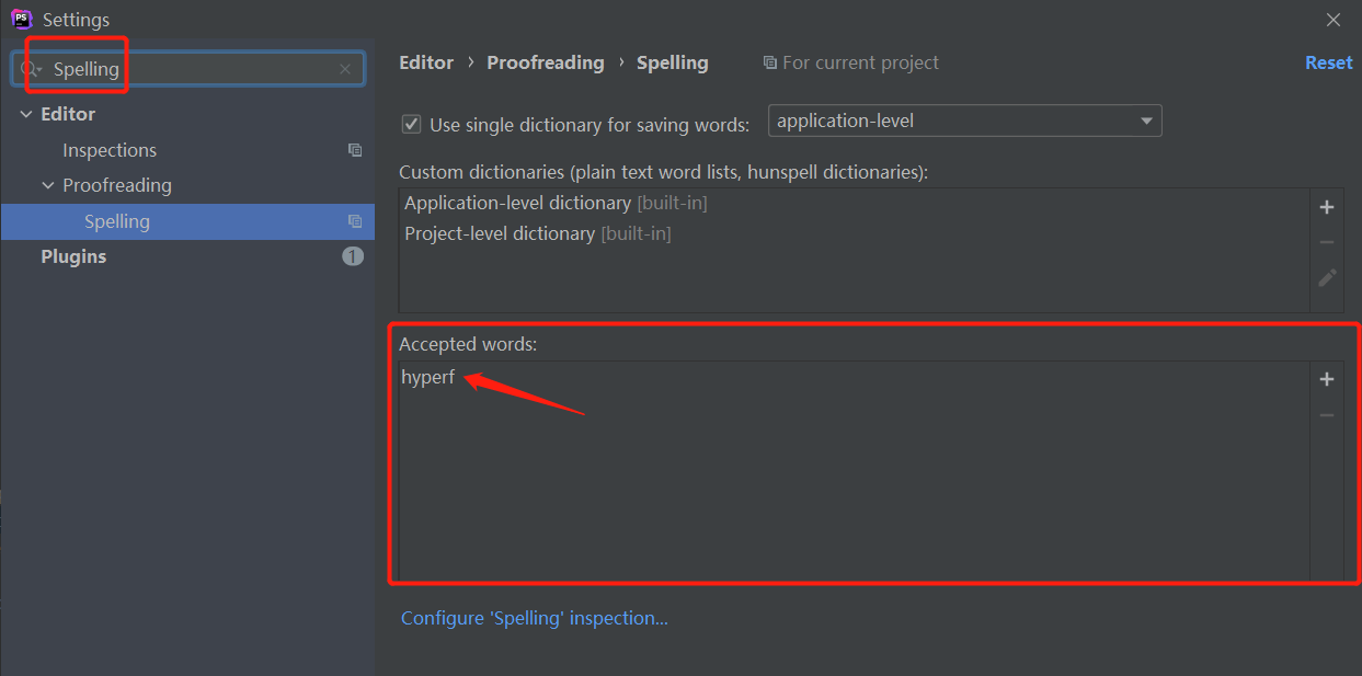 如果后续需要把某个单词移除,可以在File - Settings - Editor - Proofreading - Spelling中进行管理