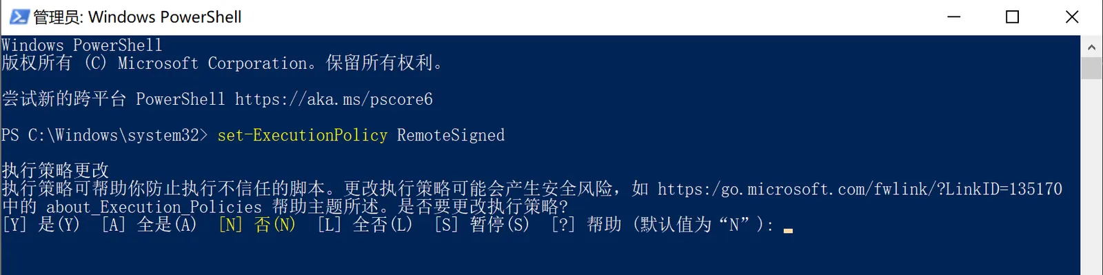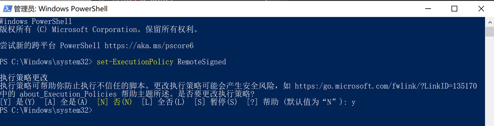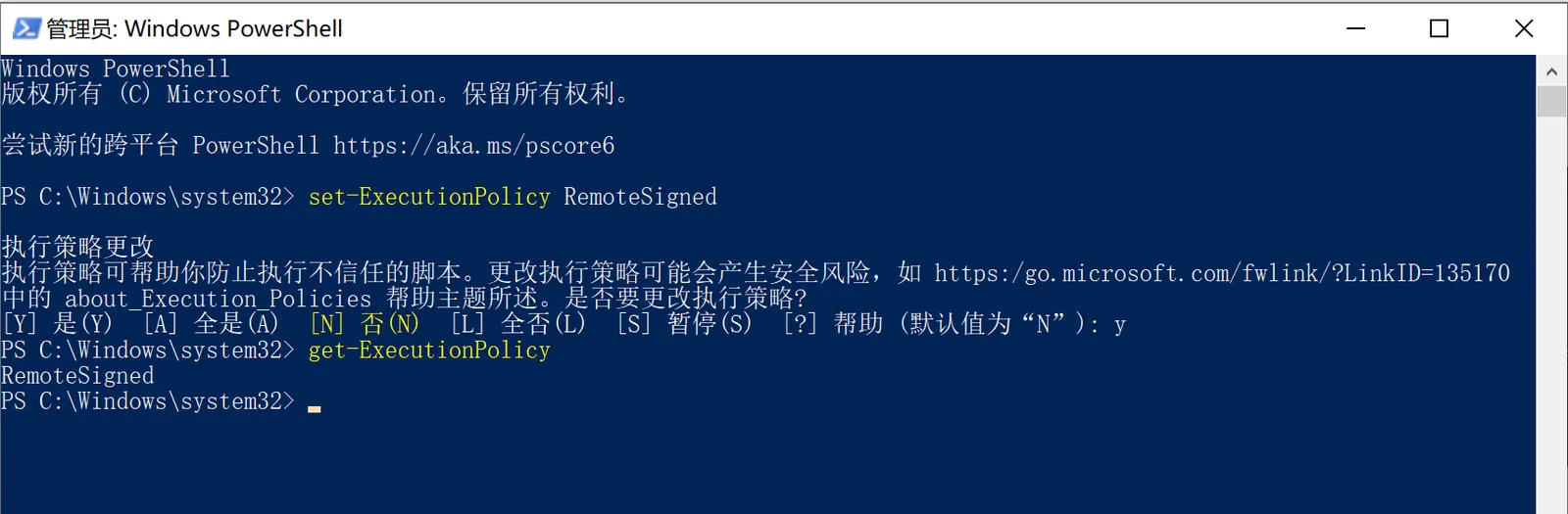 2、执行set-ExecutionPolicy RemoteSigned命令