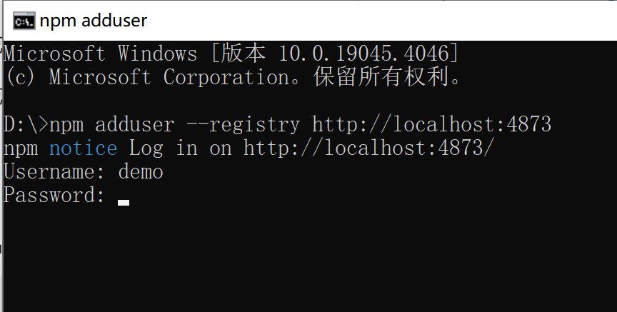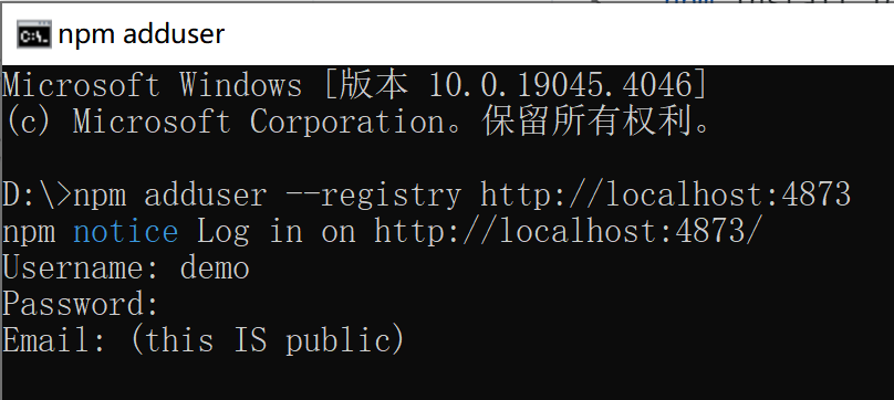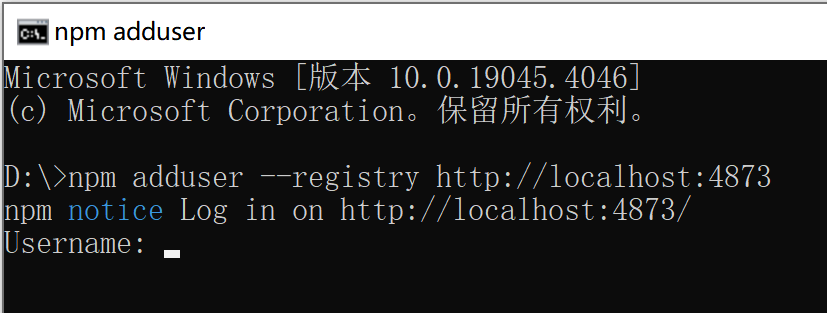 2.2 注册Local NPM账号 (1) 执行注册命令 1 npm adduser --registry http://localhost:4873