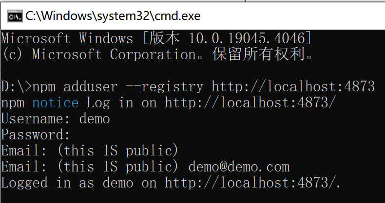 (5) 注册成功 当出现**Logged in as 用户名 on http://localhost:4873/**的提示时,代表注册成功。