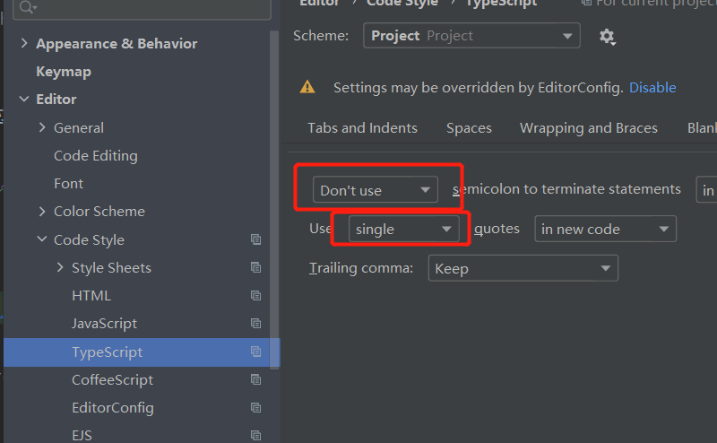 ts中使用单引号和关闭每行结尾的分号 File -> Settings -> Editor -> Code Style -> Typescript -> Punctuation